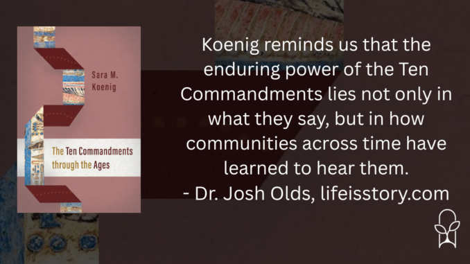 In The Ten Commandments through the Ages, Sara Koenig offers a succinct yet comprehensive exploration of one of the most influential texts in Western religious and moral imagination. Rather than treating the Decalogue as a static list of divine rules, Koenig traces an historical theology of how the Ten Commandments have been interpreted, contested, and re-imagined across centuries of Jewish and Christian thought. The result is a book that is less about settling debates and more about helping readers see just how dynamic and historically situated these commandments have always been. And while it’s only rarely brought up and not a particular focus of the book, that central thesis has great value in the current cultural debate about the Commandments in the public sphere.
