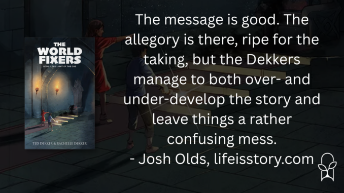 Here’s the problem: That’s not a simple explanation. It’s simplistic, yet also overly complex and taught didactically even though that’s not a great form of teaching in fiction. Everything in this book and series is about telling and not showing. The message is good. The allegory is there, ripe for the taking, but the Dekkers manage to both over- and under-develop the story and leave things a rather confusing mess.